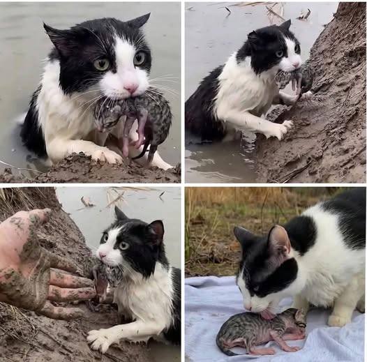 In the middle of a cold, muddy flood, a small stray cat fought against rushing water with a single purpose: protecting her newborn kitten. Exhausted, soaked, and trembling, the mother cat pushed forward using what little strength she had left, refusing to release the tiny life she carried gently in her mouth.