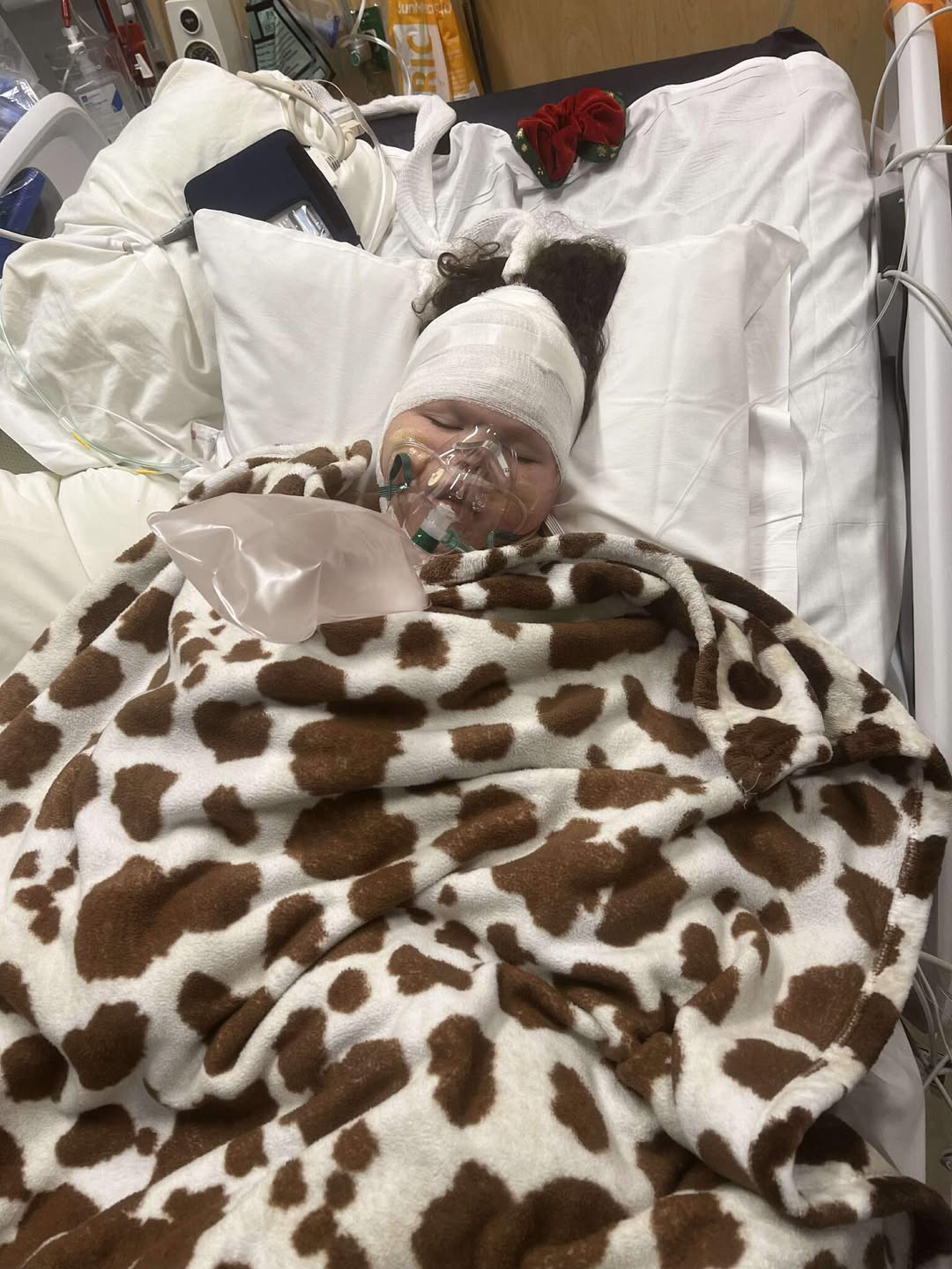 Her head was swathed in thick white bandages, each layer telling a silent story of procedures endured and battles fought. An oxygen mask covered half her face, fogging faintly with every breath, helping her weary lungs carry on their tireless work. Beneath the plastic and gauze, her face was still unmistakably that of a child—soft, fragile, and brave in ways words struggle to capture. Her eyes were closed, drifting through a dreamscape where hospital lights were replaced by open skies, laughter, and the simple freedom of being healthy again. 🌬️💤