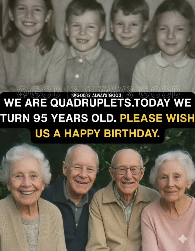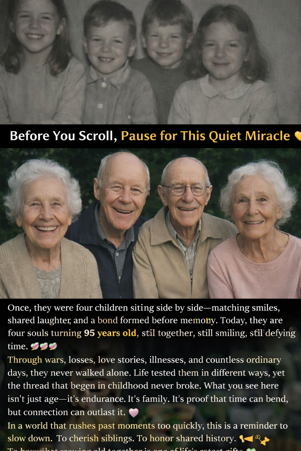 Once, they were four children sitting side by side—matching smiles, shared laughter, and a bond formed before memory. Today, they are four souls turning 95 years old, still together, still smiling, still defying time.