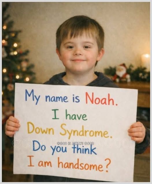 A photograph of a young boy holding a handwritten sign has quietly captured hearts and attention. On the sign, written in simple letters, are the words: “My name is Noah. I have Down syndrome. Do you think I am handsome?”