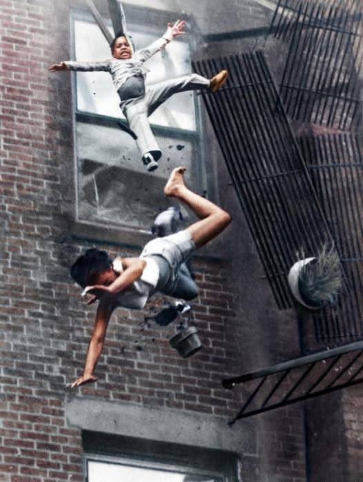 The image shows 19-year-old Diana Bryant and two-year-old Tiare Jones falling from a fifth-floor fire escape as it collapsed beneath them during a deadly apartment fire.