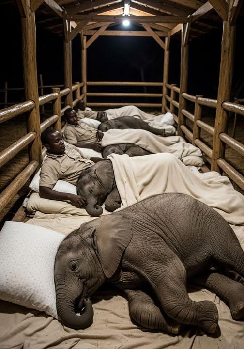 Keepers move softly among them, tucking warm blankets over small, sleepy bodies. Tiny trunks curl and uncoil, brushing against the hands that have become their new family. Soft murmurs replace cries of fear, and soon, the orphans drift into dreams — safe, loved, and protected.