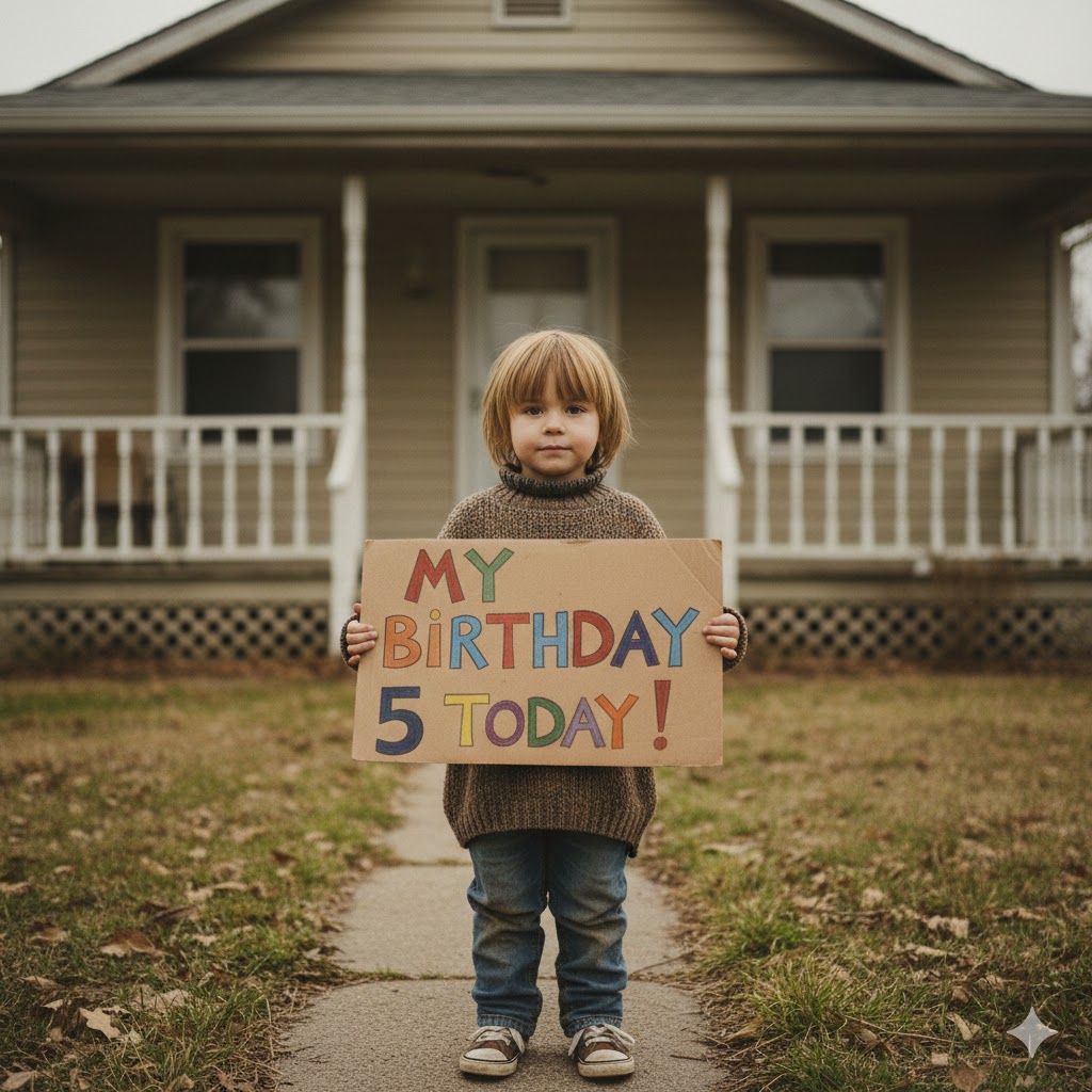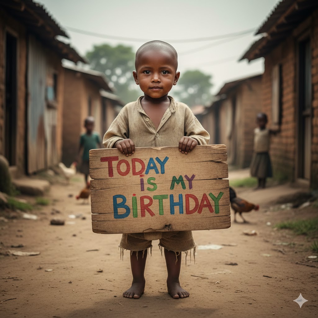 But there are no balloons, no cake, no crowd — just a child hoping to be noticed.