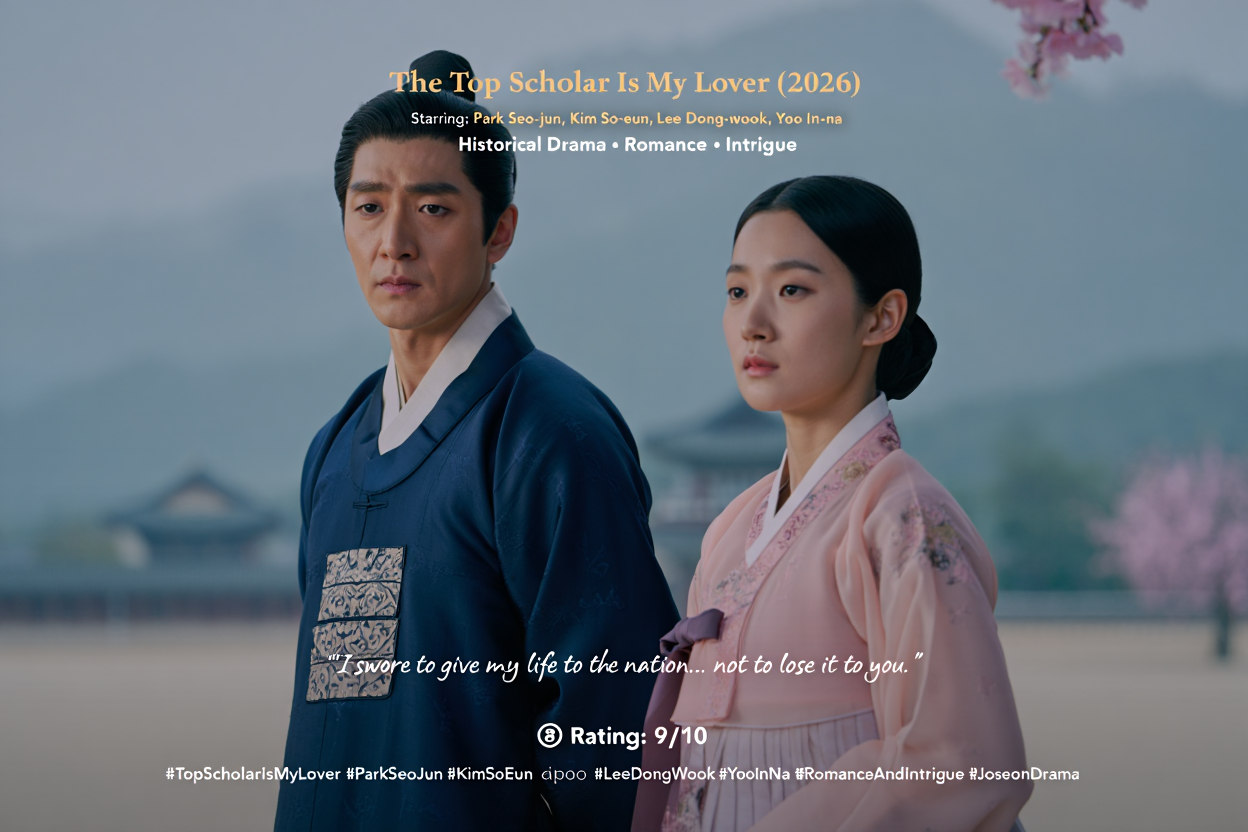 In The Top Scholar Is My Lover (2026), the royal academy of Joseon becomes a battleground not only for intellect but for love, loyalty, and power. This historical drama blends political intrigue with forbidden romance, weaving a captivating tale of a brilliant scholar, a noblewoman in disguise, and a world on the brink of upheaval. With Park Seo-jun, Kim So-eun, Lee Dong-wook, and Yoo In-na leading an extraordinary cast, this series keeps you on the edge of your seat, caught between the fiercely competitive world of academia and a love story that defies the very rules of society.