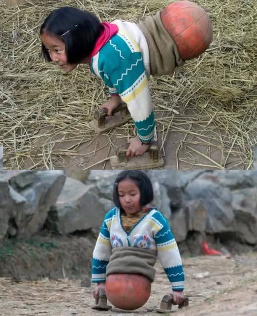 With remarkable ingenuity, Qian’s grandfather cut a basketball in half and placed her inside it, allowing her to balance her body while walking on her hands. This simple creation became her way of moving through the world — and earned her the nickname “Basketball Girl.”