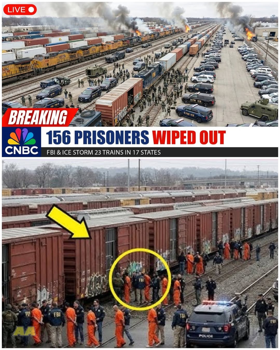 Viral posts are circulating that the FBI and ICE halted 23 freight trains across 17 states at exactly 2:00 p.m. and discovered 156 prisoners hidden inside rail cars, calling it the largest rail interdiction in U.S. history.