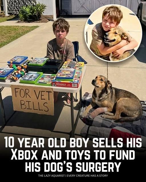 Có thể là hình ảnh về chó, đồ chơi và văn bảnHe set up a small table outside his home and began selling the things he loved most — his Xbox, his bike, and even his favorite toys. 🎮🚲 In front of him sat a simple cardboard sign: “For vet bills.”