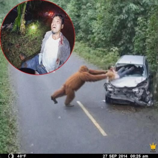 Footage from CCTV cameras installed to study animal behavior showed an orangutan approaching a badly damaged van that had crashed off the road. After inspecting the wreckage, the great ape was seen forcefully pulling open the van’s door and dragging the unconscious driver out of the vehicle.