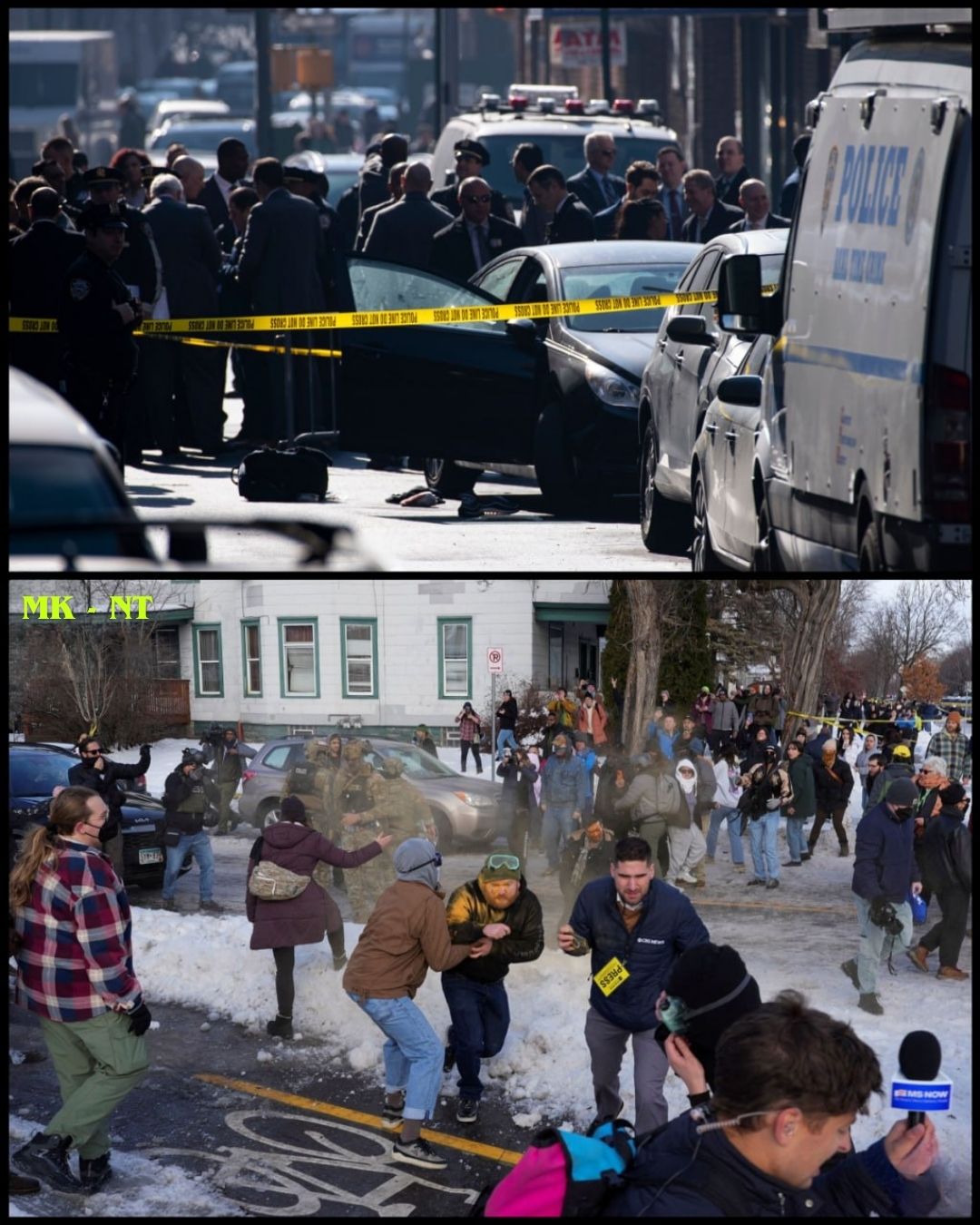 In a separate scene nearby, crowds gathered as tensions escalated, with law enforcement and civilians seen moving quickly amid a chaotic situation. ๐ธโ๏ธ