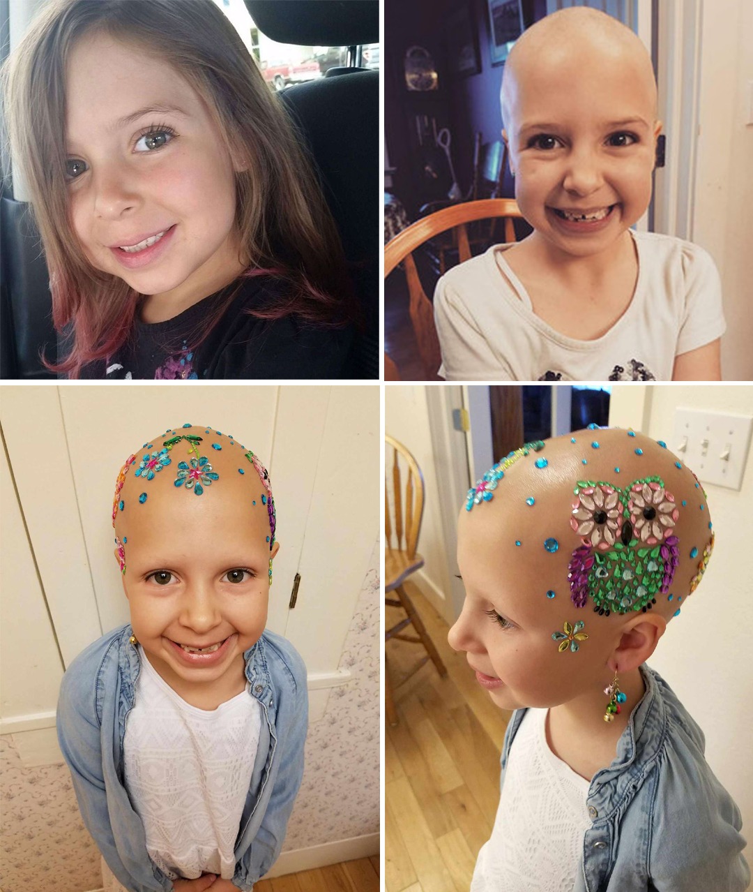 Instead, they turned it into power. 💖 With no hair to braid, her mother transformed her smooth scalp into a canvas of gems, stickers, and floral designs — creating a sparkling crown of confidence. ✨