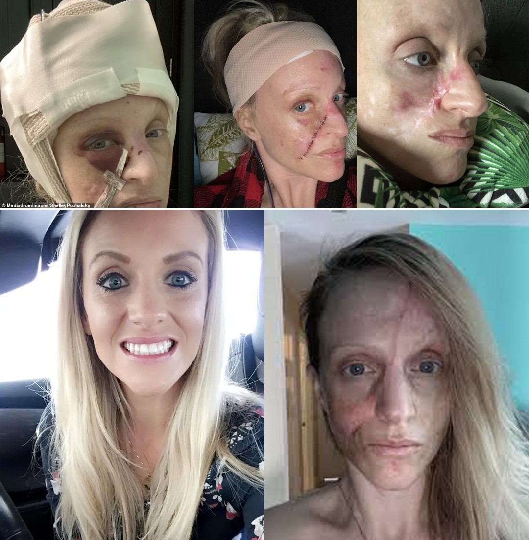 In September 2019, Shelley Puchalsky tripped over her dog, landing  headfirst in the dirt. The impact led to a skull infection and severe skin  deterioration. Although she initially received 40 stitches, theyBut days later, the wound became infected, and doctors delivered a terrifying diagnosis: sepsis and osteomyelitis, a serious bone infection. ⚠️🧠