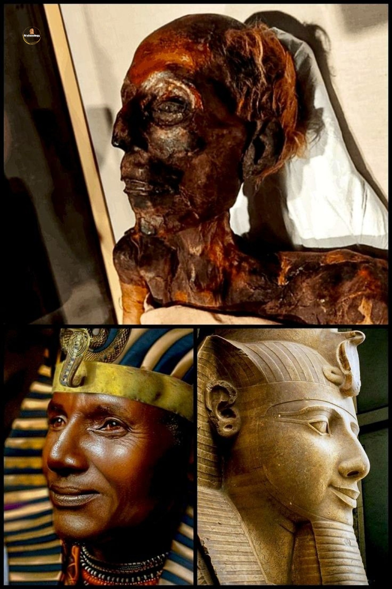 The contrast between his preserved mummy and his idealized statues reveals a powerful duality. 💀✨ The fragile skin and thinning hair of the mummy reflect human mortality, while painted portraits and towering sculptures restore youth, strength, and divine authority.