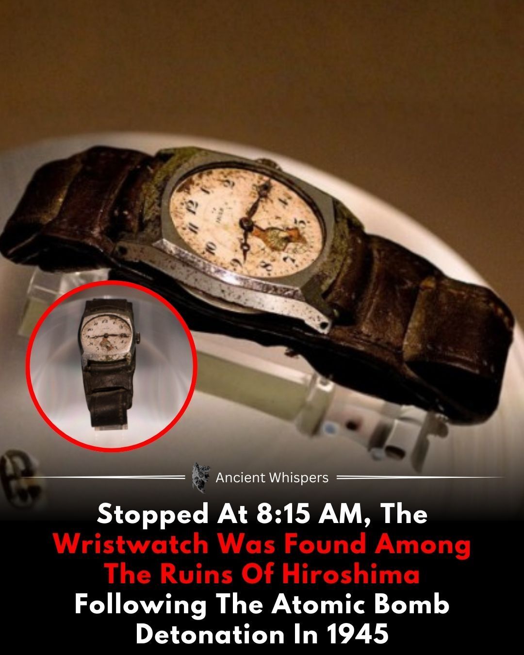 Among the ruins of Hiroshima after the atomic bombing in 1945, rescuers found a wristwatch frozen at exactly 8:15 AM — the precise moment the bomb detonated over the city. ☢️