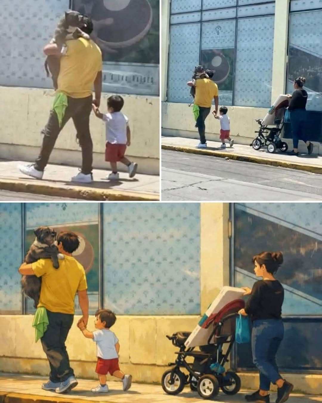 The pavement that day had become extremely hot under the scorching sun. While humans wear shoes that protect their feet, dogs walk directly on the ground with their bare paws. The father realized that the surface had become so hot it could burn his pet’s paws.