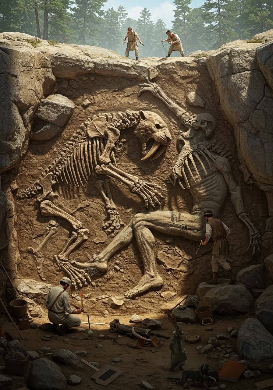 A discovery that could change everything we know about the ancient world has erupted from the dusty ground of an undisclosed excavation site. Archaeologists have uncovered a massive fossilized tableau — a towering humanoid skeleton seemingly locked in combat with a prehistoric saber-toothed predator.