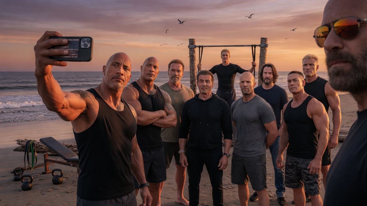 Gathered around him are icons who defined generations of action: Jason Statham, sharp and composed; Jean-Claude Van Damme, carrying the spirit of martial arts mastery; Arnold Schwarzenegger and Sylvester Stallone—two pillars of cinematic history; alongside Dolph Lundgren, John Cena, Keanu Reeves, and Dwayne Johnson—figures who continue to evolve the meaning of strength in a modern era.