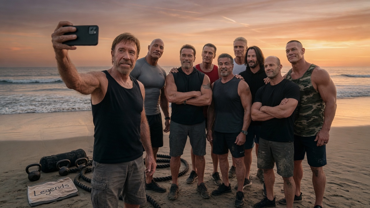 On a sunlit beach, with the raw sounds of an open-air gym echoing in the background, a simple selfie becomes something far greater. At the center stands Chuck Norris, holding the camera with quiet confidence—a man who doesn’t need to prove anything because his legacy already speaks for him.