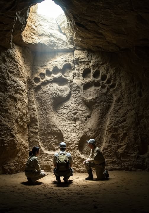 Hidden beneath layers of stone and silence, a team of explorers has uncovered one of the most perplexing archaeological enigmas of the century — a sealed cavern containing massive humanoid footprints, each imprinted deep into solid rock. Found in a remote mountain range whose location remains undisclosed for preservation, the site has been dubbed “The Cave of Giants.”