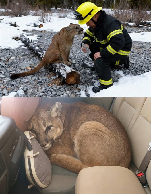 One firefighter, gathering his gear, stopped mid-step. Through the swirling smoke, something moved. At first, he thought it was a trick of the light — until the shape took form. A mountain lion, limping and covered in ash, emerged from the burning haze. Her golden coat had turned gray, her paws raw and blistered from the heat.