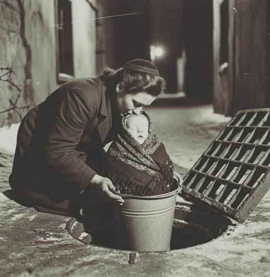 Through quiet whispers and desperate trust, she made contact with Polish sewer workers who risked their lives smuggling Jewish families through the underground tunnels beneath the city. On a night so cold it split the cobblestones, she wrapped her infant son in a thin shawl — the only warmth she had left — and placed him gently into a metal bucket. Her hands shook, not from the frost, but from the unbearable weight of what she was about to do.