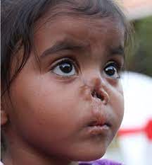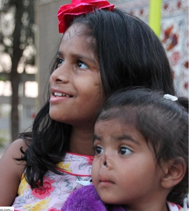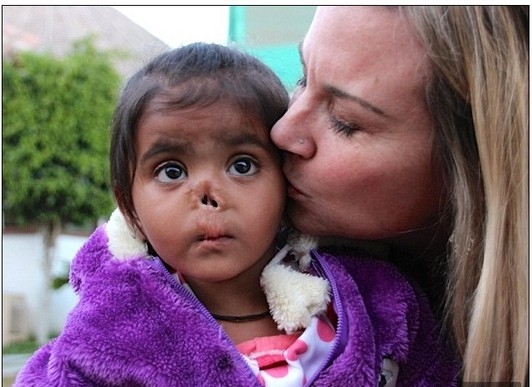Three-year-old Durga, from an orphanage in India, was born into a tragic set of circumstances. She was abandoned as an infant, and during that time, a terrible accident occurred: insects severely damaged the area where her nose should be, resulting in a significant facial disfigurement, compounded by any smaller congenital defect she may have had.