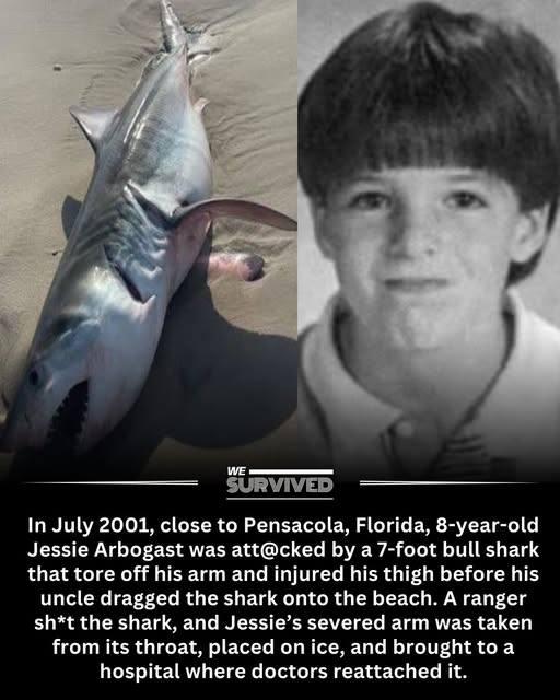 On a July evening in 2001, the peaceful shoreline near Pensacola, Florida, erupted into panic. Families enjoying the shallow surf heard sudden screams—sharp, urgent, unforgettable. In the water was eight-year-old Jessie Arbogast, who had been wading only a few feet from the sand when a bull shark, roughly seven feet long, surged toward him with terrifying speed.