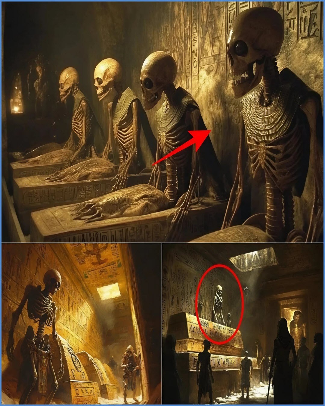 As the tomb reveals hieroglyphic inscriptions and artifacts that may reference celestial beings or gods who came from the heavens, the mystery of the skeletons deepens. Were these alien-like figures simply part of an Egyptian mythos, or do they represent a more tangible link to a forgotten past—a time when ancient Egypt was interconnected with something far beyond what we currently comprehend?