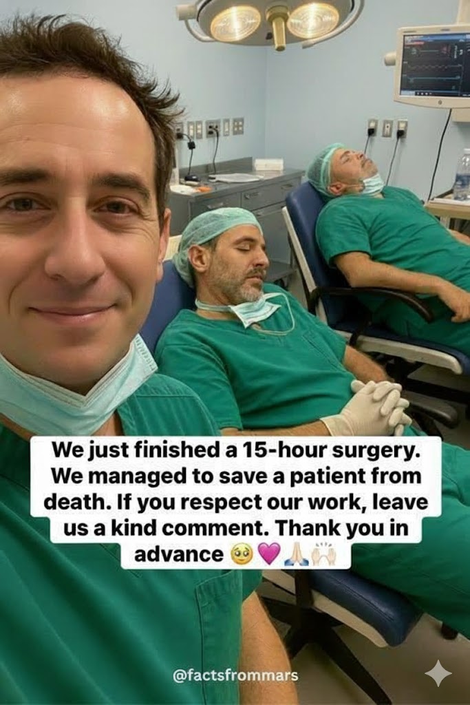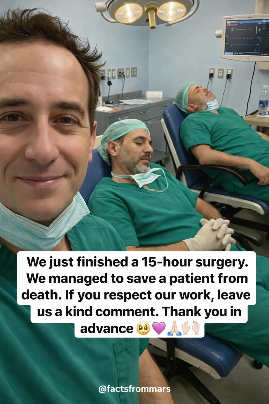 In a dim room, silence weighs heavy after a grueling 15-hour surgery that drained every drop of strength from these doctors.